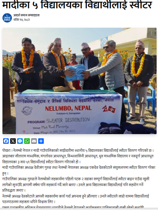 This program was conducted through a collaborative partnership between NELUMBO, NEPAL and the Madi Rural Municipality. The initiative was jointly planned, coordinated, and implemented by both organizations, ensuring shared responsibilities, resource mobilization, and effective communication throughout the process. Before the distribution, a comprehensive needs assessment was conducted to identify the exact number of sweaters required. This was followed by consultations with representatives from all five schools to determine the appropriate sizes for every student, ensuring a proper fit for maximum utility and comfort. The program not only addressed the immediate need for warm clothing among students but also promoted inclusivity by ensuring no child was left behind due to financial constraints. To ensure the fairness of the program, it was conducted in the presence of local representatives. This program demonstrates NELUMBO, NEPAL’s dedication to closing educational gaps, aiding marginalized areas, and tackling both short-term issues and long-term problems in order to empower children and create a better future.